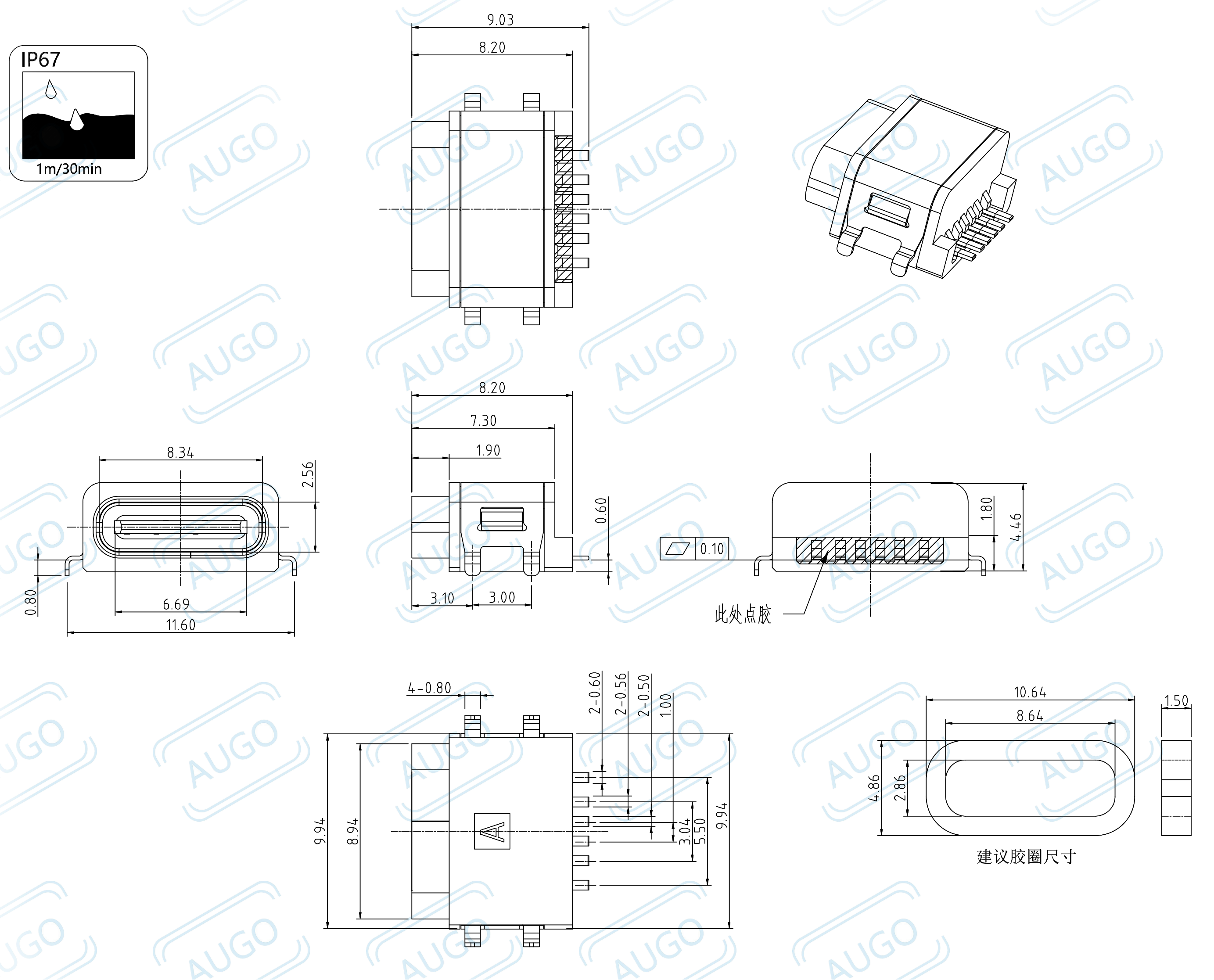 IP67级防水 6P沉板type-c 四脚插板